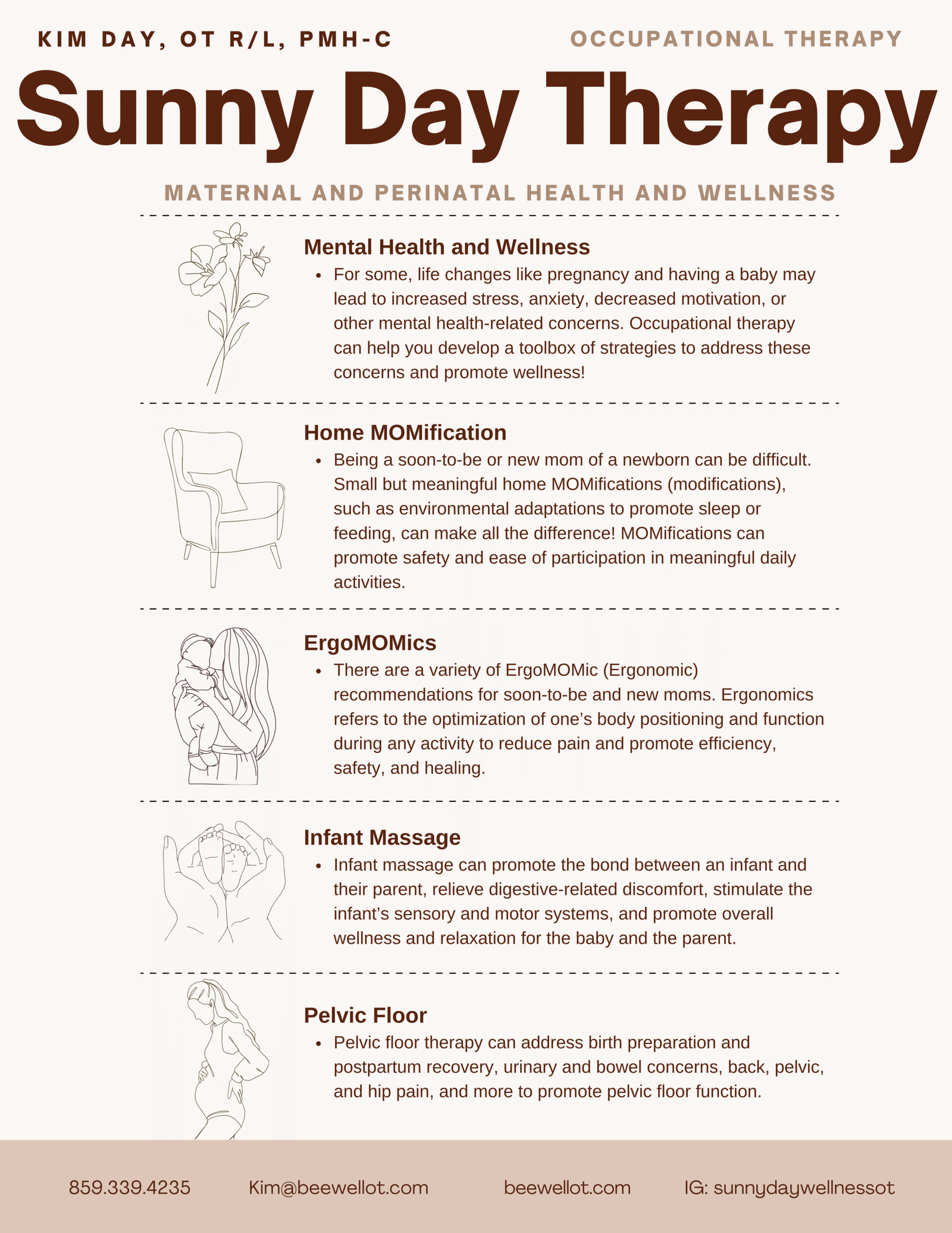 Therapy for moms- Sunny Day Therapy also offers maternal health occupational therapy and infant massage to help the whole family regulate their nervous system, understand body signs, and utilize body work, reflex, and motor skill development knowledge. Maternal health therapy addresses nervous system regulation (calming), setting up the environment, ergonomics, and pelvic health. We prioritize your needs and desires so you can do the daily activities you want with the strength you need. If you feel “lost in the laundry” or anxious, depressed, or weak, we are here for you. We help you or your child grow physically and mentally strong with a family-centered approach.