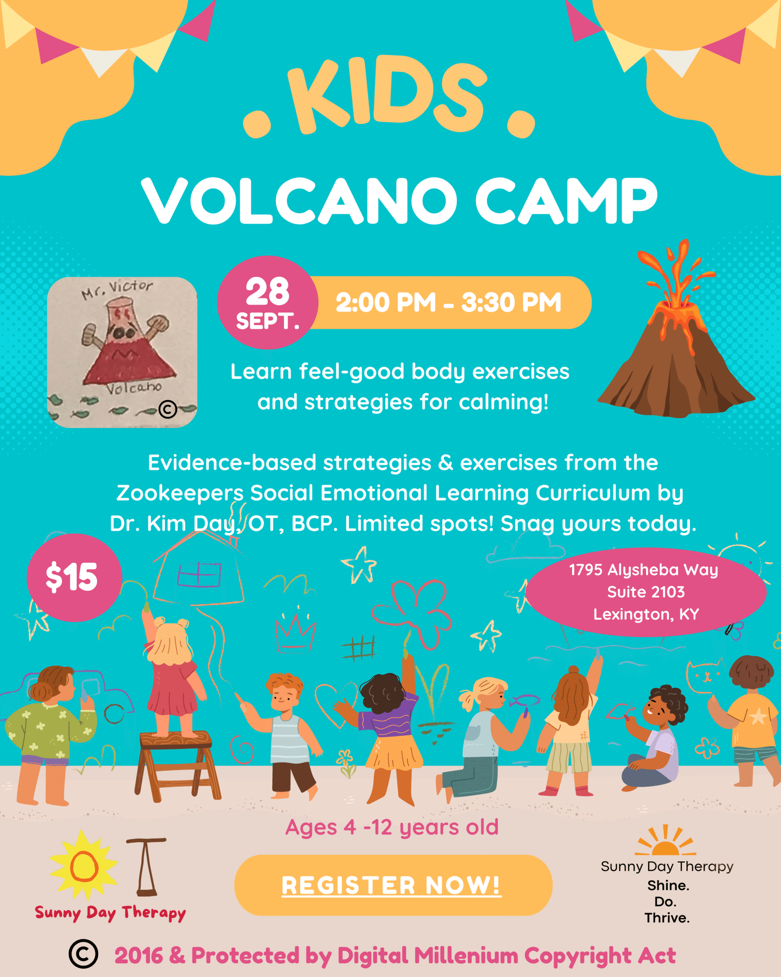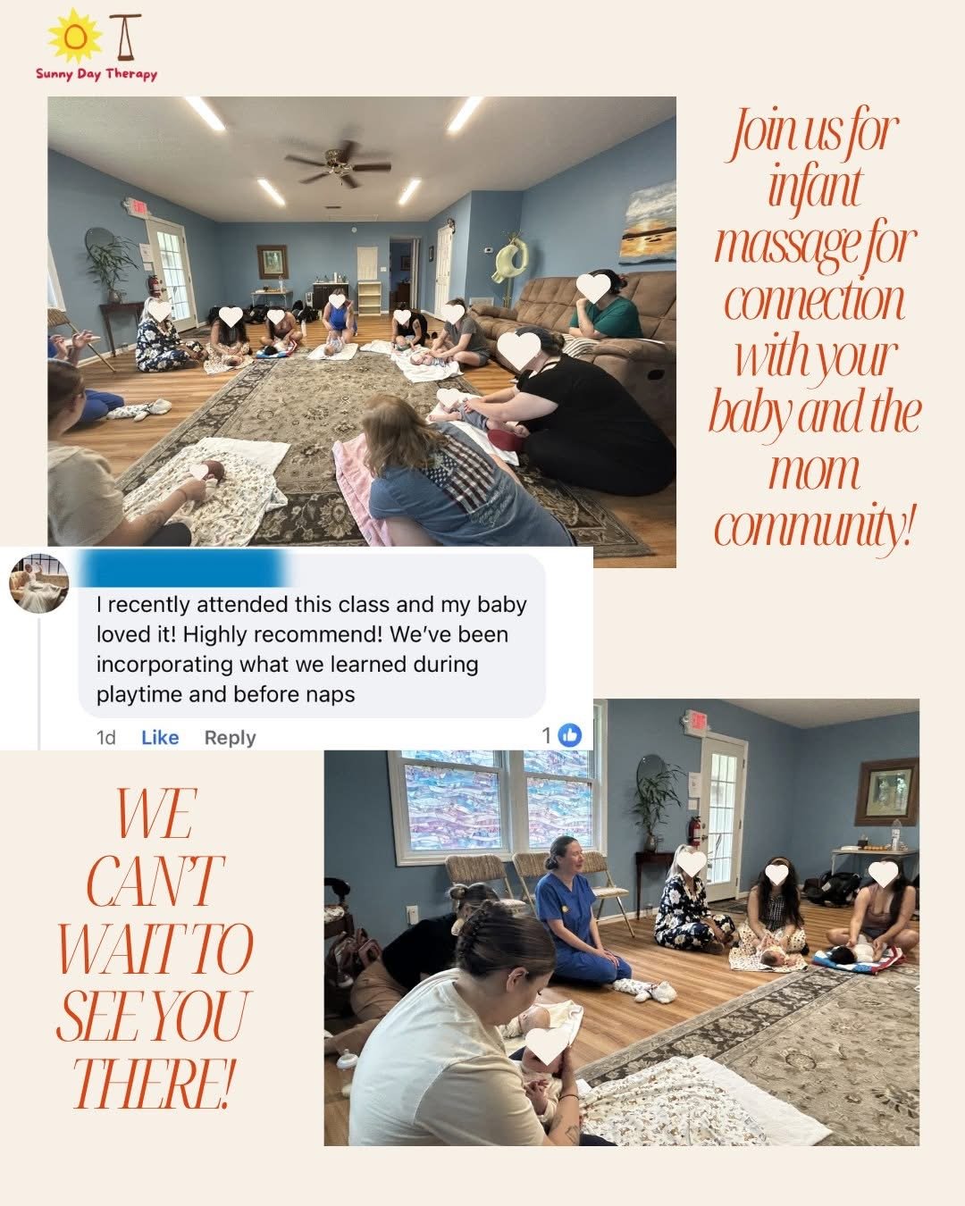 Sunny Day Therapy offers infant massage classes, and trainings for parents, teachers, and therapists such as classes about sensory integration, stress management, and emotional regulation. Dr. Day has copyrighted many educational programs to teach children how to calm their bodies and think more clearly. She has also designed programs and tools to help families with regulation including The Nourishing New Families Program and training programs for occupational therapy practitioners.
